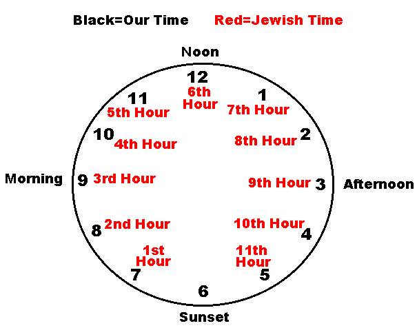 According to Mark 15:25, what time was it when they put Jesus on the cross? ___________________________ The Jews kept time differently than we do today. Our day ends at midnight, and that is also when the new day begins. The Jewish day ended and a new day began at sunset (usually about 6:00 p.m.). The clock in the following illustration helps us to understand the difference between our time and Jewish time. What we call the twelfth hour (12:00 o'clock), the Jews called the sixth hour. Nine o'clock in the morning our time would be the third hour Jewish time. Jesus was put on the cross the third hour, which means 9:00 o'clock in the morning.