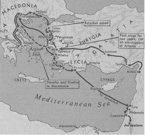 The following map shows most of the places where Paul went on his third missionary journey. Keep in mind that most of his time (about three years) was spent in the city of Ephesus: