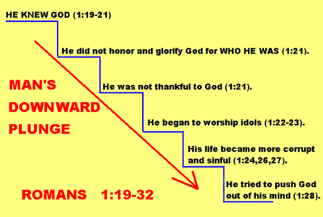 Mans downward steps are described in ROMANS CHAPTER 1. Has God revealed Himself and made Himself known to ALL MEN (Romans 1:19-20)? ________ How has God done this (Romans 1:20 and see also Psalm 19:1-6)? _________________________________________________________________ Can people who live in the deepest jungle see Gods wonderful work of CREATION? _______
