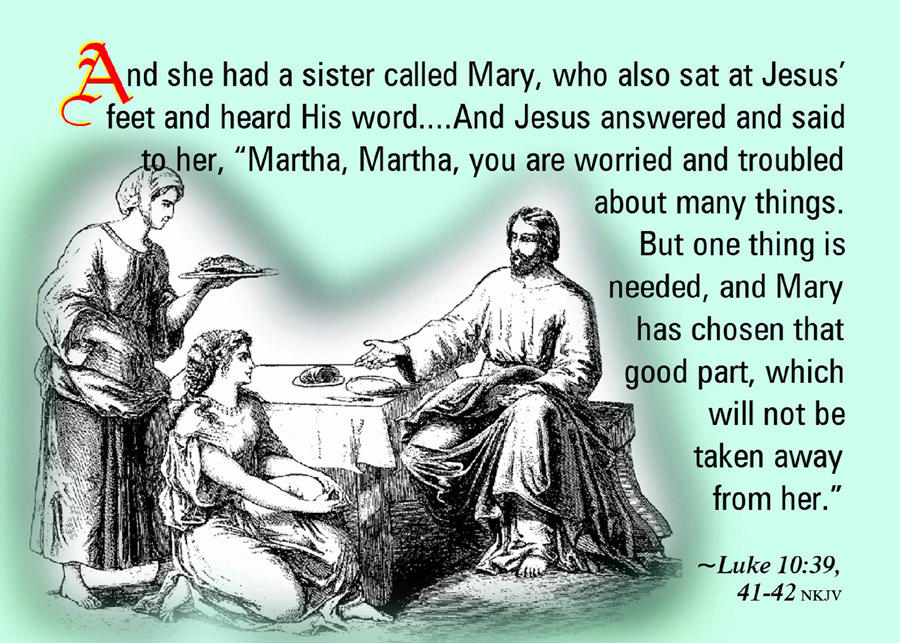 LUKE 10:38-42 38) Now it came to pass, as they went, that he entered into a certain village: and a certain woman named Martha received him into her house. 39) And she had a sister called Mary, which also sat at Jesus' feet, and heard his word. 40) But Martha was cumbered about much serving, and came to him, and said, Lord, dost thou not care that my sister hath left me to serve alone? bid her therefore that she help me. 41) And Jesus answered and said unto her, Martha, Martha, thou art careful and troubled about many things: 42) But one thing is needful: and Mary hath chosen that good part, which shall not be taken away from her. |