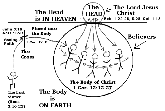 In the above diagram we see that the Head is in heaven (Col. 3:1-2) and the Church is on the earth (John 17:15). Each member of the Church is related to the Head and to each other member. No one can become a member of Christ's Church unless they go through the cross (by faith.) When a person does this, God places them (baptizes them) into His body (see 1 Cor. 12:13). |