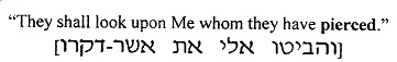 In Zechariah 13:6 we have another interesting passage which possibly pertains to the death of the Messiah, but which has also been obscured by the JPS translation: "What are those sores on your back?" The footnote has this: "Lit. sores between your arms." Both are poor translations. The Hebrew word for "back" is not used in the text, and the Hebrew word "arm" is not used either. The word that is found in the Hebrew text is the word "hand." The common English version renders it this way, "What are those wounds in your hands? [literally between your hands] Then he will say, Those with which I was wounded in the house of my friends." Messiah was wounded between or in the middle of His hands by nail wounds.