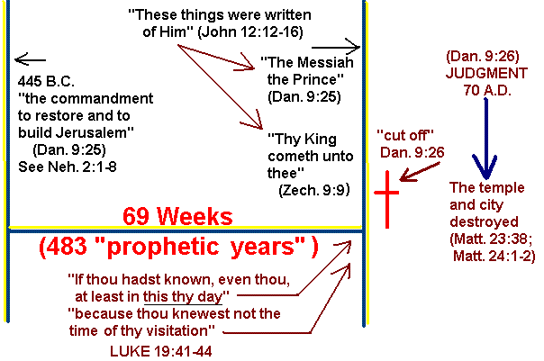 Zechariah was not the only prophet who spoke about the coming of Israels Messiah-King. The prophet Daniel also wrote about the coming of M______________ the P______________ (Daniel 9:25). According to Daniel 9:25, this great event (the coming of Messiah the Prince) marks the end (consummation) of a period of 69 (7 + 62) weeks (each "week" or "heptad" being equal to seven years with each "prophetic" year containing 360 days--compare Revelation 12:6; 11:3; 11:2; 13:5 and Daniel 9:27). After this period of 69 weeks (483 "prophetic" years), what important event would take place according to Daniel 9:26? _________________________________________________ Following this event the Romans would come and destroy "the _________________ and the ______________________________" (Daniel 9:26; Luke 19:41-44).