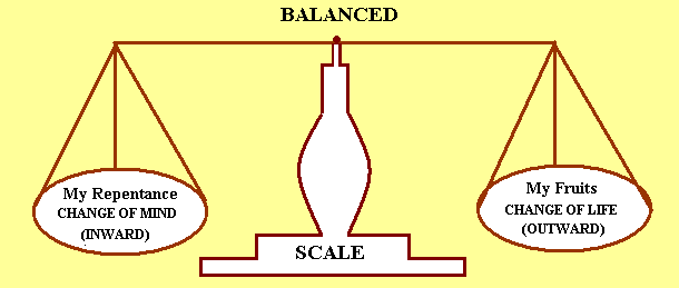 John the Baptizer gave very careful instructions to the multitude which came to be baptized by him. He told them to bring forth therefore _____________ WORTHY OF (your) ____________________" (Matthew 3:8). The Greek word translated "worthy of" means "corresponding to, equal in weight to, weighing as much as," and it was used to describe that equal condition when two weights are "BALANCED" on a scale: