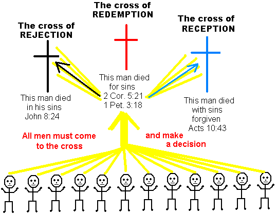 When the Lord Jesus died, there were two other crosses on which hung two guilty men—one on His right hand, and the other on His left (Mark 15:27). The Lord Jesus draws all men to that center cross where they must choose to accept or reject the Crucified One. There are only two choices, as symbolized by the other two crosses: