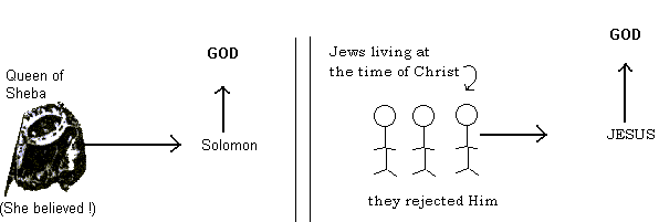 Solomon and the Lord Jesus both pointed to the one true God. Which one pointed to God most clearly, Solomon or the Lord Jesus? _________________________ The Queen of Sheba looked at Solomon, the lesser witness, and she believed and gave praise to God. The Jews looked at the Lord Jesus, the GREATER WITNESS, and they rejected what they saw and heard. She received the lesser light and they rejected the GREATER LIGHT.