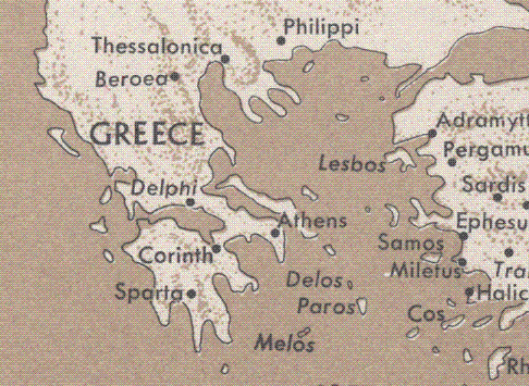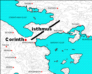 The southern part of the land of Greece looks very much like a large island except for a very narrow strip of land which connects the southernmost part with the mainland. Can you find this narrow strip of land on the map? The city of Corinth was located very near to this narrow strip of land which is called an "isthmus." [An isthmus is a narrow strip of land that connects two larger land areas.]