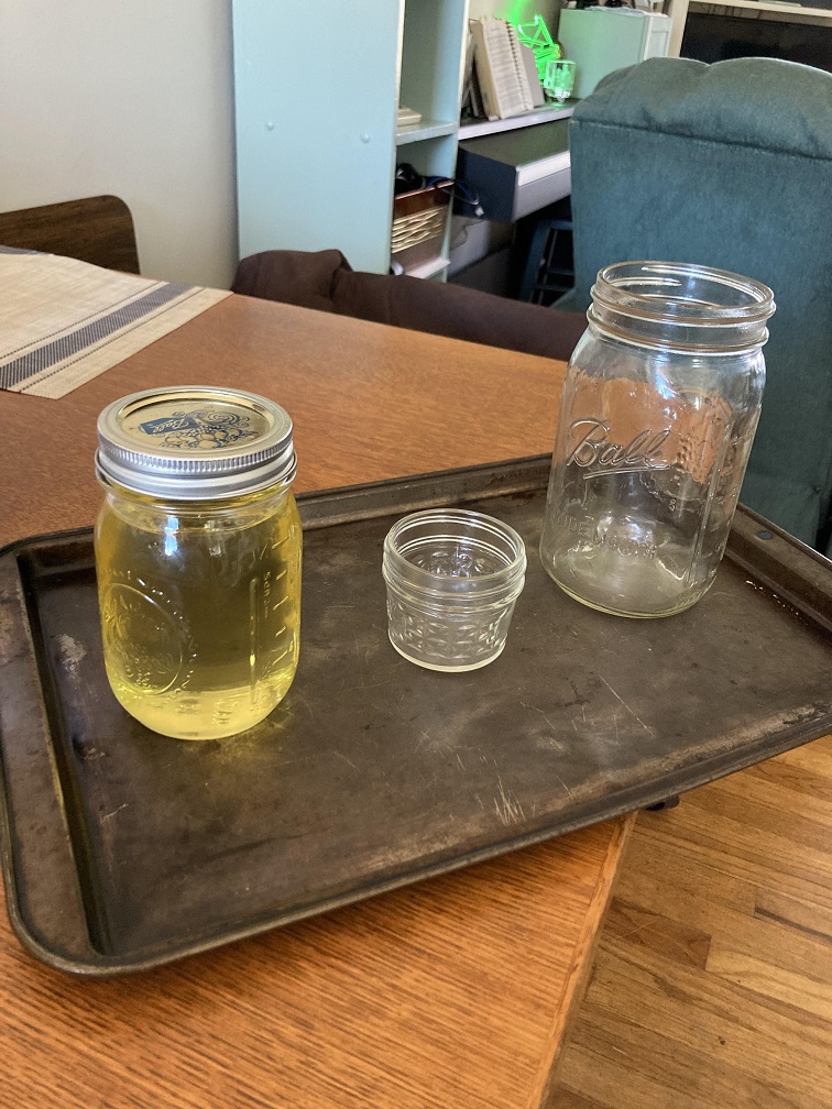 Objects you will need: One larger glass jar, one smaller glass jar, another jar with vegetable oil (I actually used olive oil) and a cookie sheet to catch any oil that might spill from pouring.