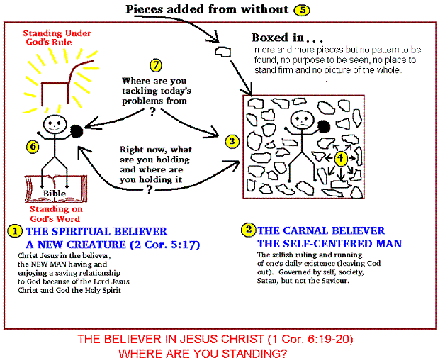 The carnal believer is boxed in! He is surrounded by PIECES (problems, places, persons, etc.). He is trying to deal with his problems without trusting God and without looking to God or to Gods Word. As you look at the chart, you will notice that there is no stable place for his feet to stand upon.