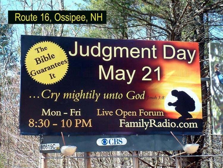 Billboards like this one were placed throughout the nation in 2011. Harold Camping, 89 year old nationally known radio host (Family Radio) predicted the exact date of the Lord’s return: May 21, 2011. He taught that the rapture would take place on this day which he also referred to as "judgment day." He also taught that the end of the world would occur five months later, on October 21, 2011. On the billboard, the claim is made that the Bible guarantees this presumptuous prediction.