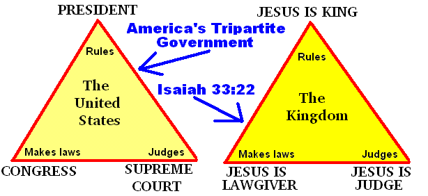 The CONGRESS passes laws. The PRESIDENT, as the nation’s leader, guides our nation, upholds the Constitution and serves as the chief commander over all the branches of the military. The SUPREME COURT makes sure that the laws are being carried out and interpreted correctly, in light of the Constitution, etc. (It is not the job of the Supreme Court to make laws.) In the Kingdom age, Jesus Christ will be the SUPREME COURT, the CONGRESS and the PRESIDENT all in One Person: "For the LORD is our ________________, the LORD is our _________________________ the LORD is our __________________________" (ISAIAH 33:22). He is the perfect Judge, the perfect Ruler or President, and He will make perfect laws! Three functions will be perfectly executed by one Person!