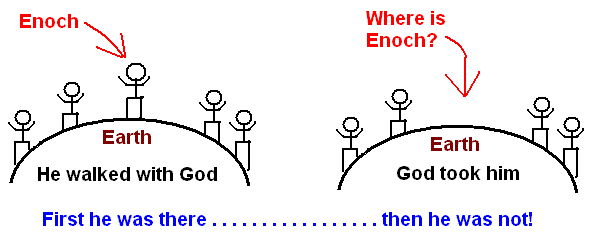 The Bible tells us what happened to Enoch in Genesis 5:24: "And Enoch ___________________ with God: and he was ________ for God ____________ him." Enoch was walking with God and all of a sudden HE WAS NOT! He was, and then suddenly he was not! All of a sudden he disappeared because God took him and removed him from the earth!