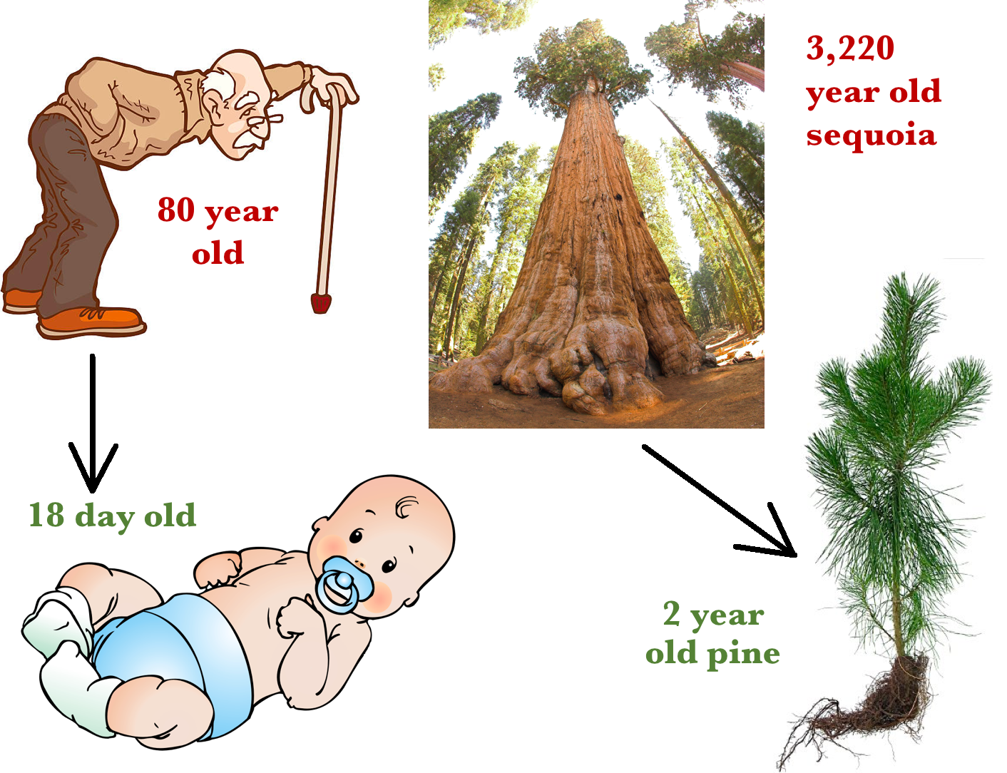 Let an 80 year old man represent the evolutionary age of the earth. Eighteen days would represent the time man has been on earth. According to evolution, the earth is so very much older than man. The evolutionary age of the earth can also be represented by a giant sequoia tree which is over 3000 years old; the time man is on earth is so short it would be represented by a 2 year old pine.