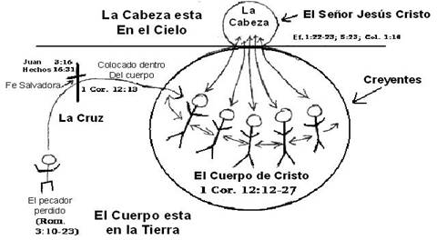En el diagrama vemos que la Cabeza está en el cielo (Colosenses 3:1-2) y la Iglesia está en la tierra (Juan 17:15). Cada miembro de la iglesia está relacionado con la Cabeza y con cada uno de los demás miembros. Nadie puede llegar a ser miembro de la Iglesia de Cristo a menos que pase por la cruz (por fe). Cuando una persona hace ésto, Dios lo coloca (lo bautiza) en Su cuerpo (ver 1 Corintios 12:13).