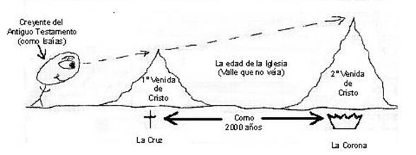 ¿Ha observado alguna vez la cumbre de una montaña desde lejos? Es posible ver algo que parece ser una cumbre, pero al acercarse, se ve que son dos montañas separadas por un valle. Esto se parece a lo que veía un creyente del Antiguo Testamento cuando miraba hacia el futuro. Podía ver dos cumbres de montañas (la primera y la segunda venida de Cristo), pero no podía divisar el valle entremedio (la edad de la Iglesia).