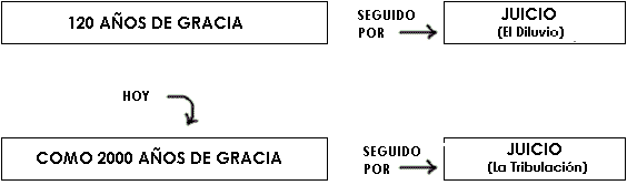 Los 120 años de gracia en los días de Noé finalmente terminaron y Dios juzgó al mundo con el diluvio. Este período más largo de gracia que estamos viviendo ahora (casi 2000 años) también llegará a su término y Dios juzgará nuevamente al mundo. El tiempo de la mayor gracia (el tiempo actual), será seguido por el tiempo del mayor juicio (LA GRAN TRIBULACIÓN). ¿Ha habido o habrá algún tiempo tan difícil como la gran tribulación (Mateo 24:21)? _________ En el capítulo 11 (titulado el tiempo de la Tribulación) estudiaremos el Período de Tribulación en detalle.