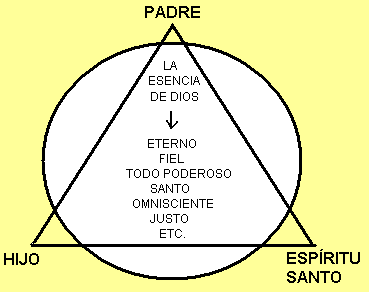 Otra ilustración de la Trinidad puede ser de ayuda (y que ya ha sido usada en los diagramas de arriba) es el TRIÁNGULO EQUILÁTERO.