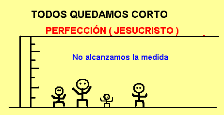 ¡Comparados con Cristo, no alcanzamos la altura! Recordemos al entrenador de baloncesto. El dijo que nadie que midiera menos de 1.90 m. podría integrar el equipo. Dios dice que ¡nadie que no alcance la altura de Jesucristo puede ir al cielo! Esto significa que ninguno de nosotros puede llegar al cielo, porque TODOS hemos fallado en estar a Su altura. (Dios sabía que todos los hombres quedarían cortos y por ello delineó un plan de salvación que hizo posible que los pecadores creyentes pudieran ser tan justos como Cristo, “ como ÉL es justo" (1 Juan 3:7).