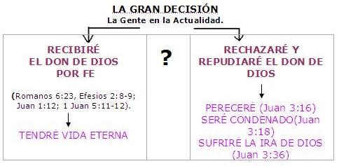 ¿Qué decisión has tomado? ¿Has obedecido al evangelio o lo has desobedecido (compare 2 Tesalonicenses 1:8)? ¿Has obedecido el mandato de Dios "CREE EN EL SEÑOR JESUCRISTO" (Hechos 16:31 y 1 Juan 3:23)? Adán tenía que tomar una gran decisión, ¡PERO TÚ TAMBIÉN! Adán no podía permanecer neutral. El COMÍA o NO COMÍA el fruto prohibido. Del mismo modo tú no puedes mantenerte neutral. Cada persona tiene que recibir el regalo de Dios o rechazarlo. No puedes ser medio creyente y medio incrédulo. O eres 100% creyente o 100% incrédulo. No hay término medio. Eres salvo o no eres salvo.
