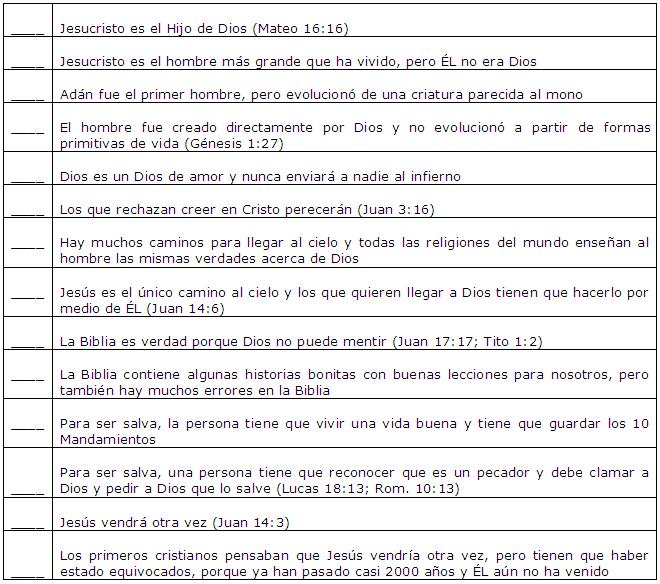 Lea las siguientes afirmaciones que una persona puede hacer, y si la persona cree la Palabra de Dios, ponga la letra C en el espacio, y si la persona no cree la Palabra de Dios, ponga las letras NC