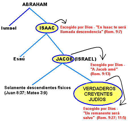 En los días de Cristo, los judíos se enorgullecían de ser hijos de Abraham (ver Mateo 3:9; Juan 8:33, 37, 39, 44). Los judíos pensaban que todos los que procedían de Abraham eran bendecidos y eran recipientes de las promesas. Ellos pensaban equivocadamente que todos los que descendían de Israel eran el verdadero Israel. Ellos fallaron en darse cuenta de que un verdadero judío debía tener cuatro PADRES—Abraham, Isaac, Jacob y DIOS. Compare a los ismaelitas (los árabes de hoy) que pueden reclamar a Abraham como su padre. Compare los descendientes de Esaú (edomitas) que pueden reclamar a ambos, Abraham e Isaac. Comparar los incrédulos judíos de los días de Cristo que reclamaban a Abraham, Isaac y Jacob (los tres) como sus padres, pero el problema es que Dios no era su padre (Juan 8:42). Necesitas a los cuatro para calificar como verdadero judío: Abraham, Isaac, Jacob y DIOS. Una persona llega a estar relacionada correctamente con Dios sólo por fe personal.