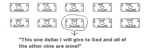 Sometimes people are taught to give God a TITHE (a tenth part). This means that out of every ten dimes, one dime would go to God. Out of every ten quarters, one would go to God. Out of every ten bags of flour, one bag would go to God: