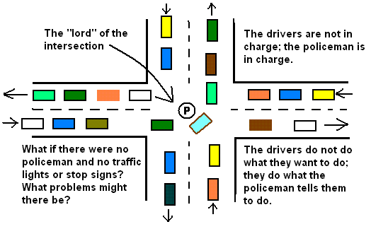 Think of a policeman directing traffic at a busy intersection: