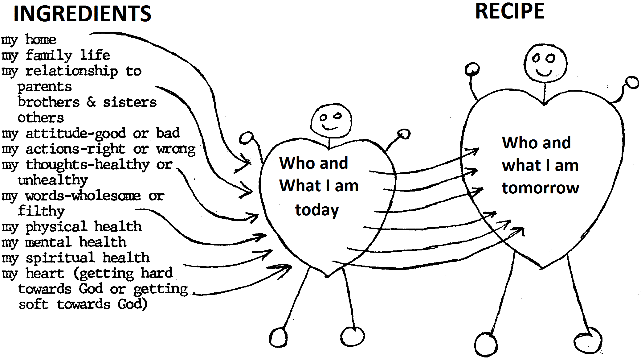 The ingredients that you are working with today will make possible the recipe of tomorrow. If you have no flour today, are you prepared to make bread tomorrow? _____ If you have no ice cream today, are you prepared to make a milk shake tomorrow? ________ If you have no chocolate chips today, are you prepared to make chocolate chip cookies tomorrow? _______ The recipe which you will make tomorrow depends on what ingredients you have today. This is the way it is with living. There are certain ingredients that go to make up my life today and these same ingredients will work together to make me what I will be tomorrow: