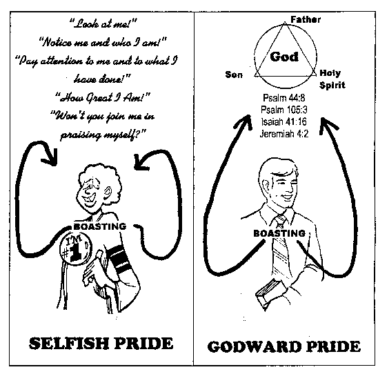 BOASTING (bragging) in and of itself is not sinful. It quickly becomes sinful when we boast in ________ (1 Cor. 3:21) or in ourselves. When God created us He wanted us to be proud creatures--PROUD OF HIM!! There is nothing wrong with pride, but we must make sure pride is directed not toward self, but toward God. How we need to develop GODWARD PRIDE! Are you PROUD of the living God, the Creator of the universe? The following illustration will help us to see the difference between boasting in self (sinful boasting) and boasting in the Lord (righteous boasting).